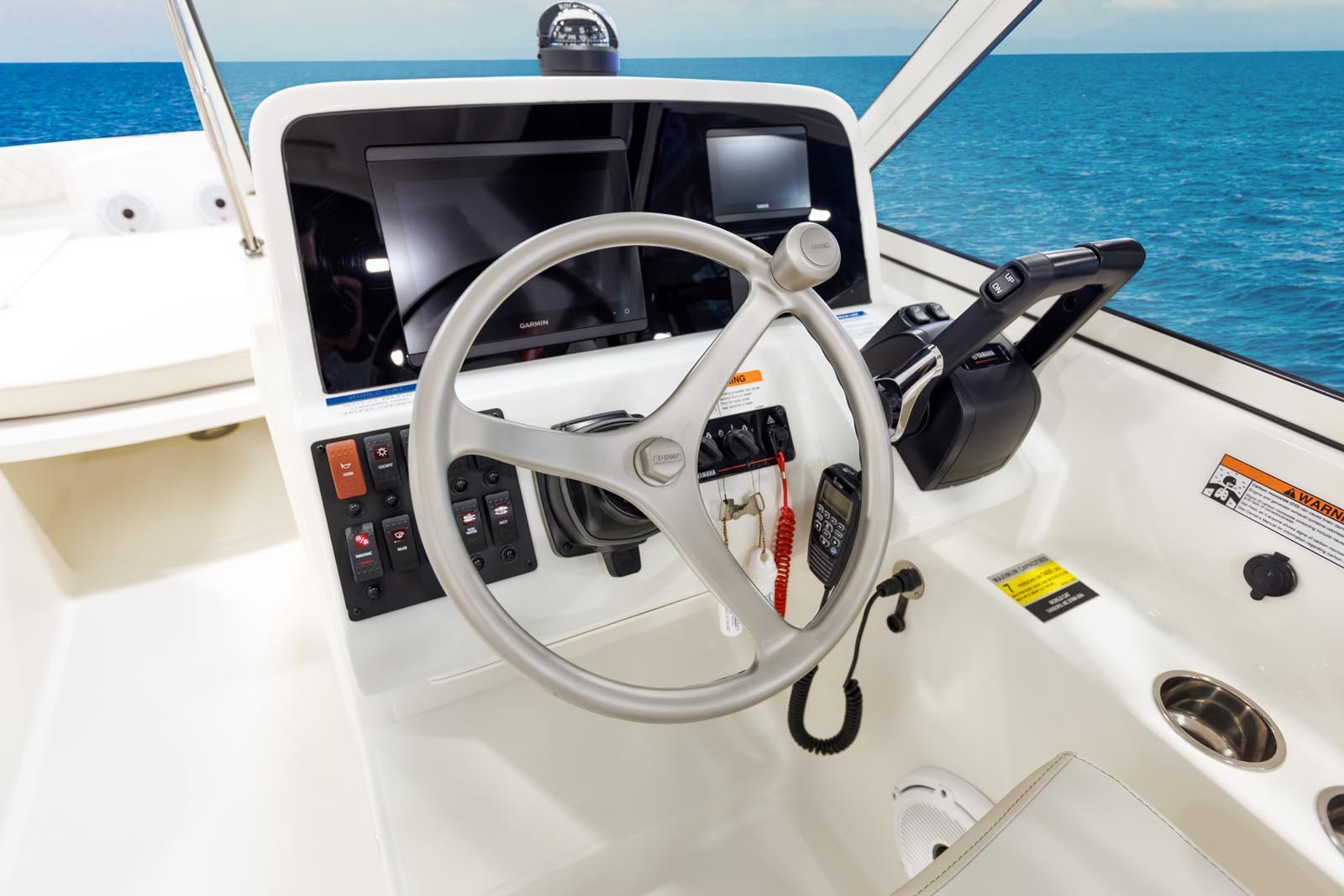Enjoy the forward view and space with the expansive cushioned bow seating for 4 adults and relax with built-in cupholders and easy-reach grab rails.