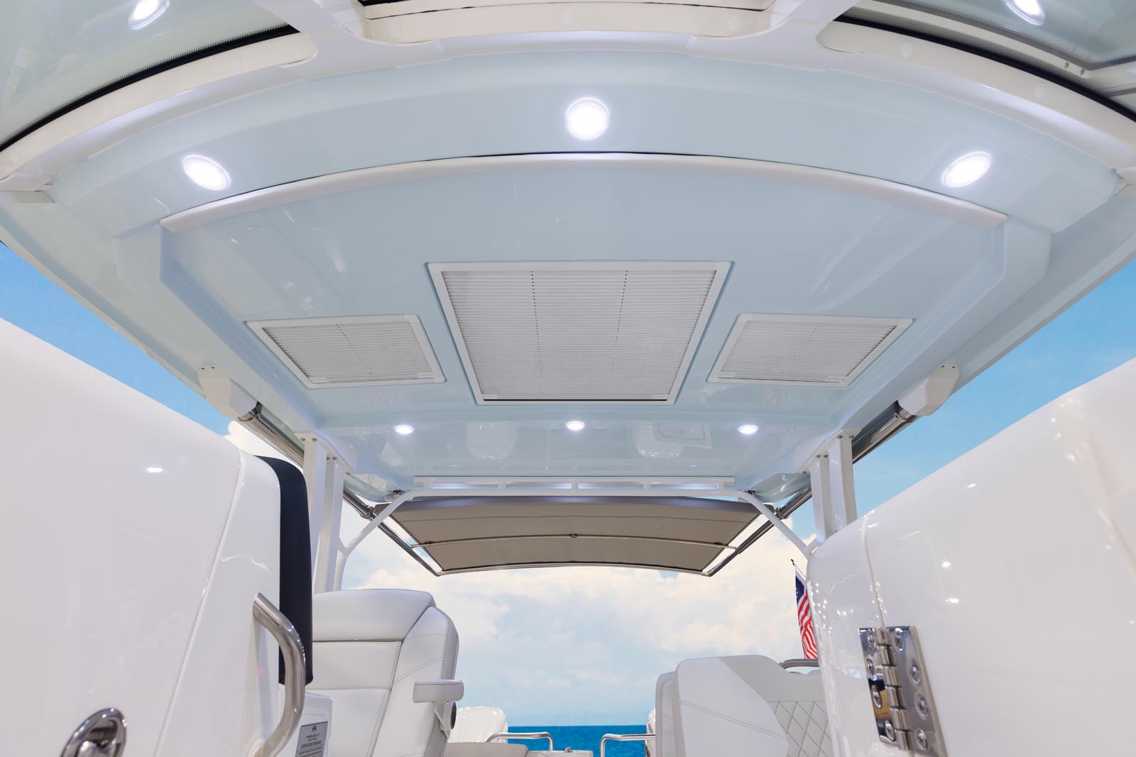 With room for two, the twin Double-Wide bow Lounge seats have angled cushioned backrests and headrest along with inboard flip-down armrests.